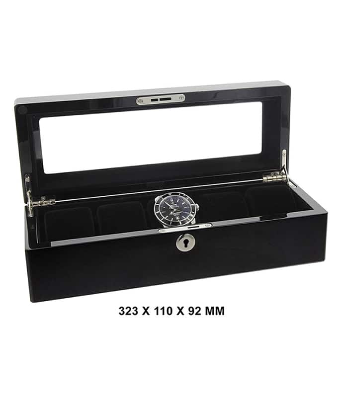 Klocklåda med svart yta för 5 klockor. 323 x 110 x 92 mm.