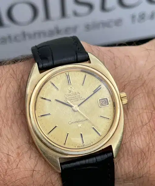 Omega Constellation tillverkad i slutet av 60-talet. Guld på stål och med en otroligt vacker champagnefärgad linne-tavla.